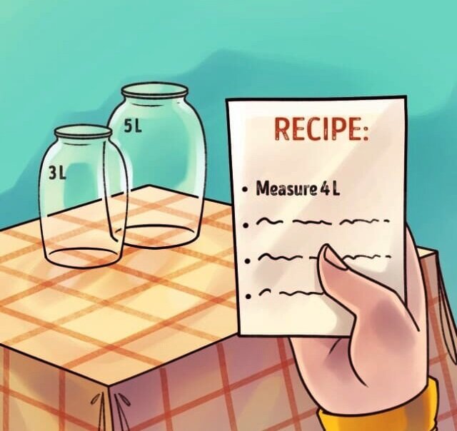 당신은 무제한으로 물을 사용할 수 있는 상태에서 눈 앞에 5리터, 3리터 용량의 병이 각각 하나씩 있슶니다. 두 개의 병을 활용해서 정확하게 4리터의 물을 측정해보세요